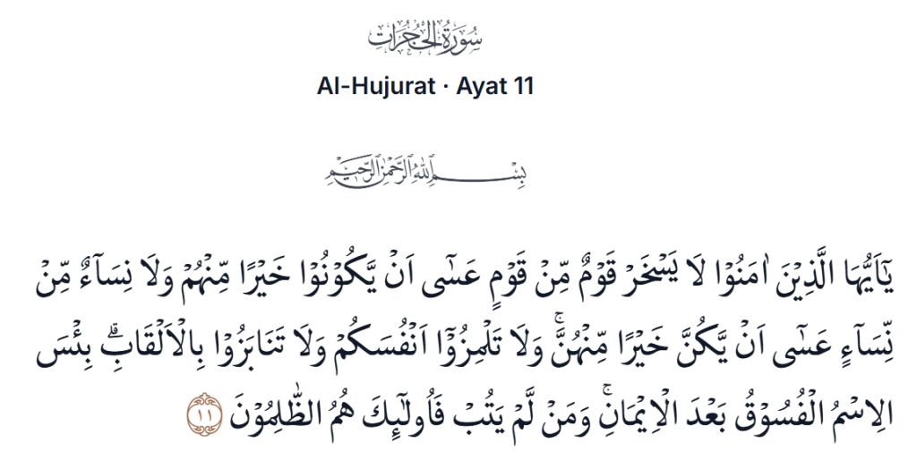Artinya: “Wahai orang-orang yang beriman, janganlah suatu kaum mengolok-olok kaum yang lain (karena) boleh jadi mereka (yang diolok-olokkan itu) lebih baik daripada mereka (yang mengolok-olok) dan jangan pula perempuan-perempuan (mengolok-olok) perempuan lain (karena) boleh jadi perempuan (yang diolok-olok itu) lebih baik daripada perempuan (yang mengolok-olok). Janganlah kamu saling mencela dan saling memanggil dengan julukan yang buruk. Seburuk-buruk panggilan adalah (panggilan) fasik setelah beriman. Siapa yang tidak bertobat, mereka itulah orang-orang zalim.”